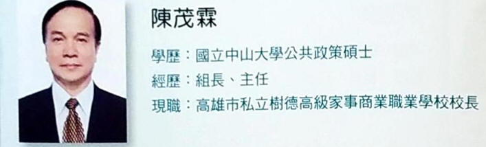 陳茂霖先生是標準樹德人 , 從該校設備組長、人事主任、總務主任、教務主任一路往上榮升,迄今服務已有40年教職之久。自民國94年開始推動英文資優班成立,101年參加全國英文單字比賽榮獲高中、職組單字比賽個人獎項和團體獎項雙料冠軍並至今蟬聯七連霸,學生外語能力的傑出表現,許多家長都將樹德家商應用外語科列為子女學習外國語言的首選學校。致力於培養學生的自信,學校樂舞旗隊19度榮獲室外管樂合奏最高榮譽『特優獎』並第27度代表高雄市參加美國波特蘭玫瑰花節大遊行暨龍舟比賽,勇奪國際友誼賽冠軍;積極培養美容美髮技術達人、培育國手,至今已培育36位美容美髮國手,美容科校友傅美慧更獲得102年國家代表參加德國萊比錫國際技能競賽,為全臺唯一國際美容冠軍;台灣網界博覽會上摘下13面金牌等。更帶領學校榮獲『技職之光』、『推動品德教育成效卓著』、『品德實踐運動』績優學校、『校務評鑑一等獎』、『教專評鑑典範學校』、『創意學校標章』等獎項。